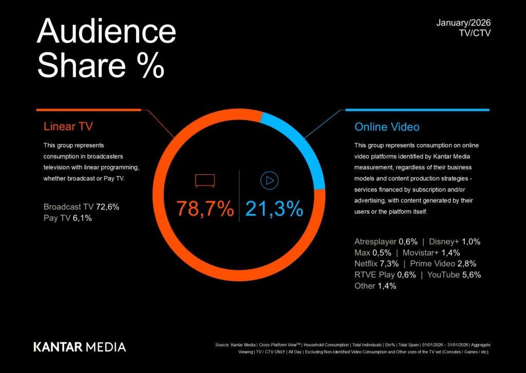 Data from Cross-Platform ViewTM, Kantar Media’s solution that offers a global vision of audiovisual consumption through unified metrics, shows the audience share (%) during January 2026 on TV sets in Spanish households.