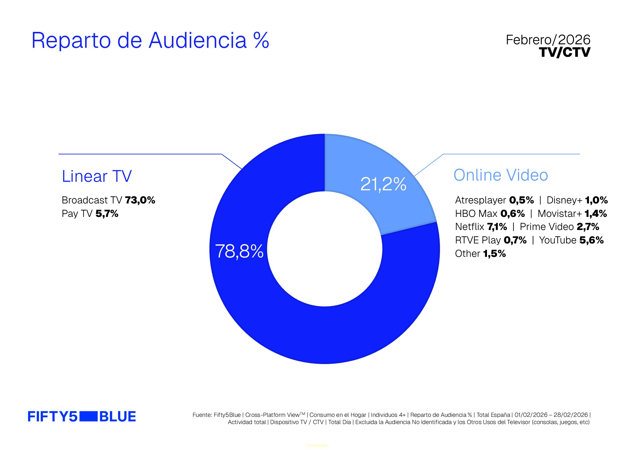Los datos, sacados de Cross-Platform ViewTM -una solución de Fifty5Blue que ofrece una visión global del consumo audiovisual a través de métricas unificadas-, muestran el reparto de audiencia (%) durante Febrero de 2026 en las televisiones de los hogares españoles.