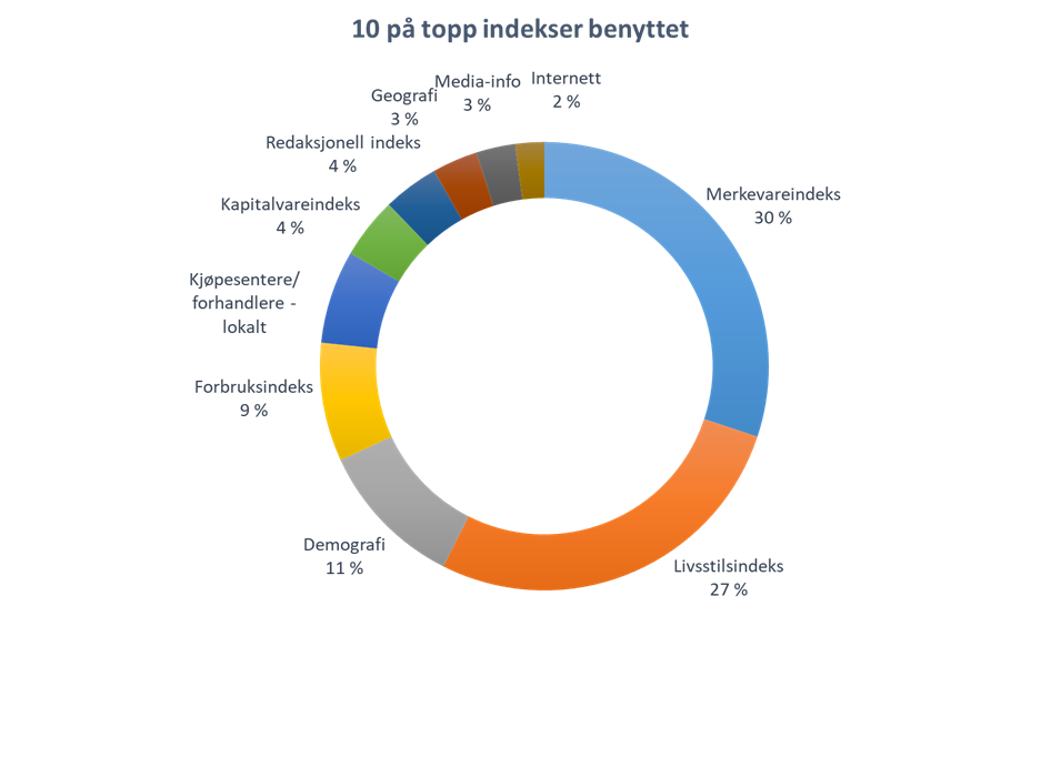 Informasjonen i Forbruker & Media er delt inn i ulike indekser, og ved å se på utnyttelse av variabler innenfor disse indeksene kan man danne seg et bilde av hvilke indekser som blir mest benyttet.