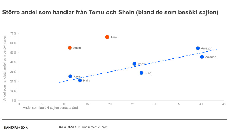 I grafen nedan ser vi andelen som besökt sajten på x-axeln. På y-axeln ser vi de som har handlat som en andel av de som besökt sajten. Ju längre ut till höger desto fler som har besökt sajten och ju högre upp desto större andel av besökarna har också handlat. Vi har plockar ut några aktörer att jämföra Temu och Shein emot. För dessa referenssajter ser vi ett nästan linjärt samband mellan besökt och handlat ifrån: ju fler som besökt sajten desto större andel som säger sig ha handlat ifrån. Shein och Temu sticker i stället ut, och visar en väsentlig högre kvot än den som man kunde ha väntat sig givet besöksfrekvensen.