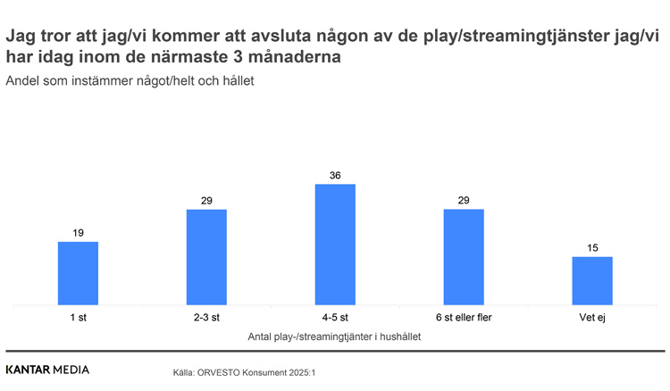 De yngsta visar högst benägenhet att avsluta någon av de play/streamingtjänster de har inom 3 månader: 35–44 år (36,8 % instämmer något eller helt och hållet) och 25–34 år (35,2 %). Att de unga vuxna är mer benägna att omvärdera sina abonnemang kan bero på en ökad priskänslighet men även större vana att byta tjänster eller delning av abonnemang.