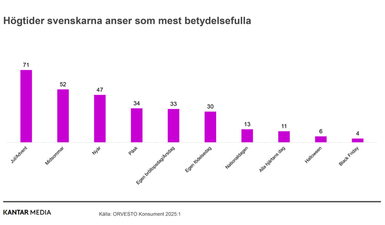 Svenskarna gillar högtider och att uppmärksamma speciella årsdagar. Och det är de mest traditionella högtiderna som Jul, Påsk och Midsommarafton som är de högtider som vi svenskar uppskattar allra mest. Över 70 % av svenskarna anser att Jul är en mycket betydelsefull högtid för dem. Jul som högtid är betydelsefullt oavsett ålder men yngre målgrupper som Millenials och Generation Z anser att Julen är mest betydelsefull av alla åldersgrupper. Och det är framför allt dessa målgrupper som verkar uppskatta de högtider vi har frågat om allra mest. För Generation Z är det egentligen bara Nationaldagen och Påskfirande där graden av betydelse är underindexerad i jämförelse med genomsnittet.