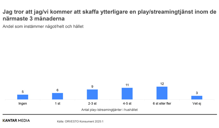 Tittar vi på påståendet utifrån hur många play/streamingtjänster man har i hushållet ser vi att intresset för att lägga till fler tjänster är störst bland dem som redan har 4–6 tjänster, vilket kan tyda på ett starkt intresse för innehåll snarare än kostnadsbegränsningar.