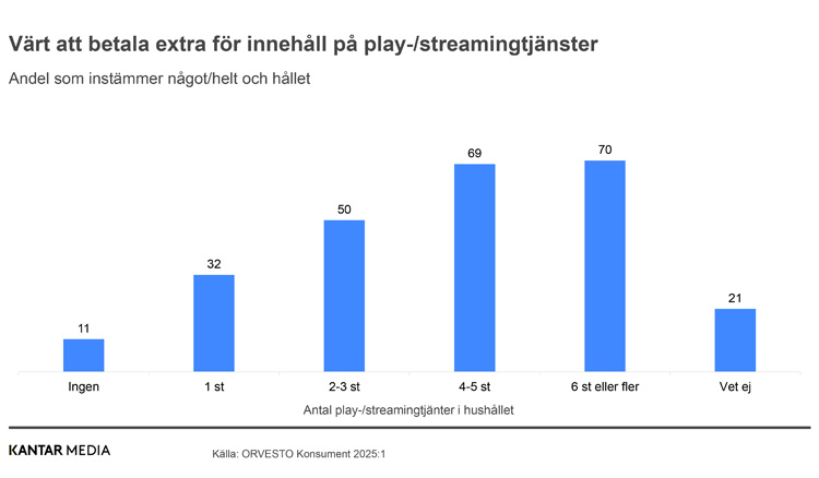 Sedan tidigare har vi även flera värderingspåståenden i ORVESTO Konsument kring just konsumenternas inställning till play- och streamingtjänster som går att följa både över tid och analysera i specifika målgrupper. Till exempel påståendet ”Det är värt att betala extra för innehåll på play/streamingtjänster” där vi ser en tydlig trend: ju fler streamingtjänster ett hushåll har, desto mer benägna är de att tycka att det är värt att betala extra för innehåll.