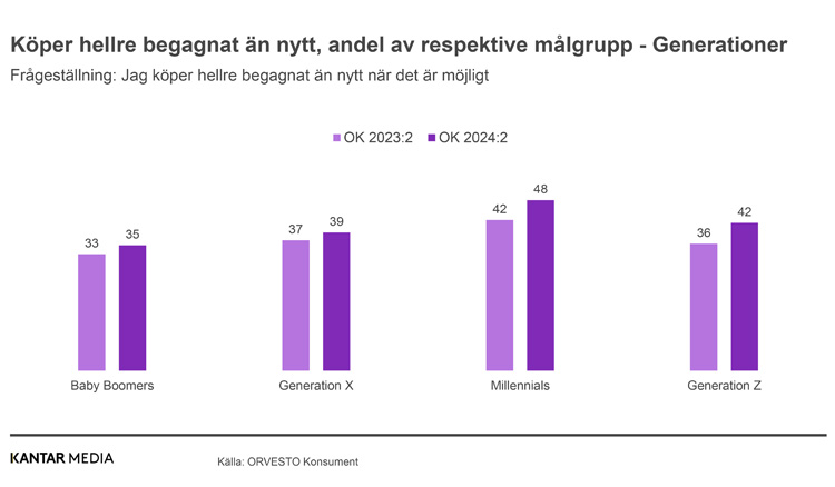 Det är en större andel av kvinnorna (47%) än av männen (35%) som instämmer i detta påstående. Fördelningen i hela gruppen som anger att de hellre köper begagnat är 56,5% kvinnor respektive 43,5% män. Sett till de olika generationerna är det hos Millennials vi ser störst andel som instämmer i detta, men samtliga generationer visar på en ökning jämfört med hur det såg ut i samma undersökningsomgång förra året.