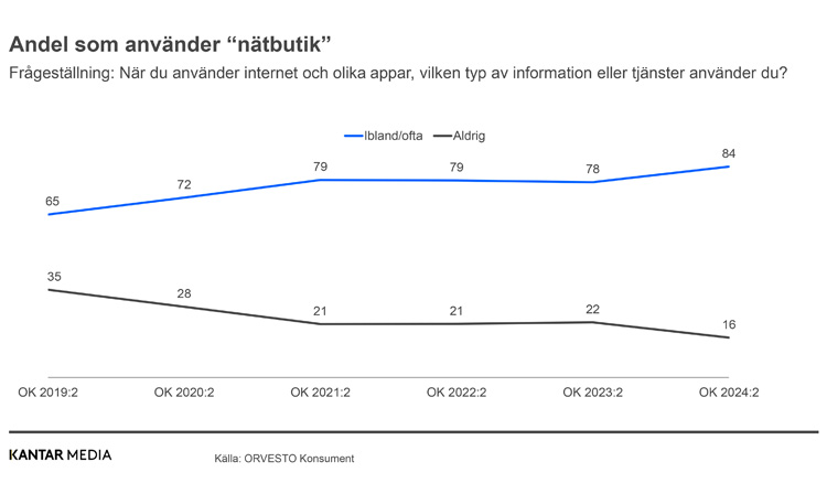 Under pandemin syntes en snabb utveckling för e-handeln då svenskarna givet omständigheterna i större utsträckning började nyttja digitala kanaler även för sina inköp. Efter pandemin har delar av konsumtionen återgått till de fysiska butikerna, samtidigt syns en fortsatt positiv utveckling för e-handel i data från ORVESTO Konsument 2024:2. Exempelvis för frågan om man använder nätbutik via internet/appar.