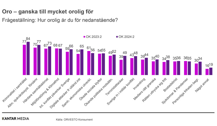 Alla dessa saker sammantaget påverkar oss på olika sätt. Frågan om hur orolig man är över olika saker i samhället har varit med sedan ORVESTO Konsument 2023:1. Vid en jämförelse mellan den nya undersökningen och hur data såg ut i samma undersökning förra året syns en ökning av oro för samtliga alternativ, förutom när det kommer till samhällets ekonomiska utveckling som backar något, liksom oron för sjukdomar och pandemier.