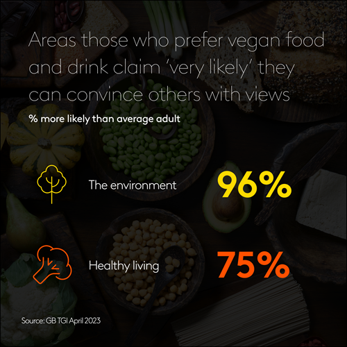 Those who prefer vegan food and drink believe they can be very persuasive on a range of issues, not least the environment and healthy living, both of which they are far more likely than the average adult to believe they can convince others with their views.