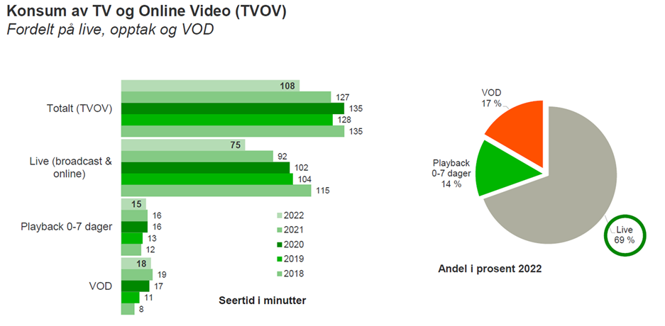 Personer 10-79 år i Norge så i gjennomsnitt 1 time og 43 minutter på TV og online video daglig i 2023, en nedgang på 5 minutter fra 2022. Video on demand (VOD)-innhold fra TV-selskapenes nettspillere står for 20% av totalkonsumet med 21 minutter i gjennomsnitt per dag, mens andelen tidsforsinket seing står for 14 prosent av seingen med 14 minutter i 2023.
