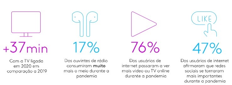 Dados do estudo Dimension em 2020 mostram que 63% dos consumidores conectados preferem ver publicidade em plataformas que eles apreciam (contexto), 74% disseram ver várias vezes o mesmo anúncio e que é muito repetitivo (eficácia) e 53% buscam na internet as marcas que veem anunciadas (resiliência).