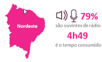 A Kantar IBOPE Media acaba de lançar a edição 2020 do INSIDE Rádio, estudo que reúne insights sobre os comportamentos e hábitos dos ouvintes, a adaptação do rádio para a web, as novas formas de consumo de áudio (como podcasts e conteúdo on demand), e o cenário das atividades publicitárias. O estudo traz leituras regionais e aponta que o tempo médio consumido de rádio por dia no Nordeste é de 4 horas e 49 minutos, e impacta 79% das pessoas. Fortaleza e Recife saem na frente com 82% de ouvintes, já em Salvador a média é de 72%. Oficialmente, o rádio nasceu no Brasil em 1922. Prestes a comemorar 100 anos no país, esse meio de comunicação continua se adaptando às novas tecnologias e fazendo sucesso no país e no Nordeste.