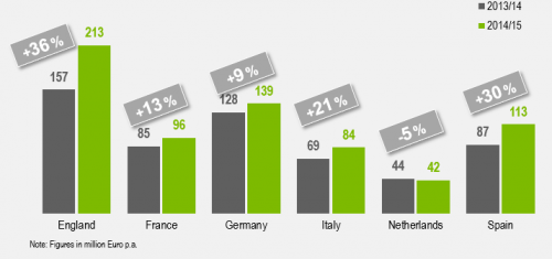 O faturamento com a inserção de logos em camisas dos times que participam das seis maiores ligas de futebol da Europa atingiu o valor de €687 milhões, o que representa um aumento de mais de 20% na última temporada em comparação com a anterior, sendo o investimento estrangeiro uma das principais causas deste incremento. É o que aponta o estudo “2014/15 Jersey Report”, do IBOPE Repucom, que apresenta um panorama do patrocínio esportivo nos principais campeonatos de futebol do continente.