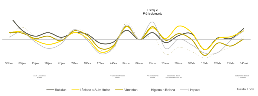 Realizando mais refeições em casa, o consumo de alimentos e bebidas nessas ocasiões cresceu 27%. As ocasiões do almoço e jantar lideram, com aumento de 30%, seguidas pelo café da manhã (+25%) e lanches rápidos (+21%). Entre os itens mais consumidos no período, estão leite condensado, creme de leite, cerveja, leite e catchup/atomatados.