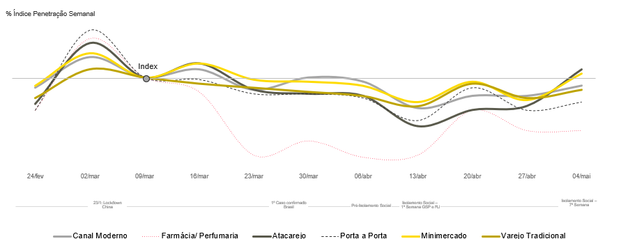 Além disso, há demanda latente por canais digitais, e essa experiência já vem conquistando os consumidores. No Brasil, em média, o e-commerce* cresceu 2,3 nas 4 semanas após o bloqueio, e na América Latina, o número chega a 3,3.