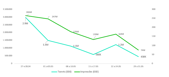 Outra tendência que apareceu durante a pandemia e que tem todo o potencial de continuar após a quarentena é o fenômeno das lives. Das 216 lives analisadas nos finais de semana entre 25 de abril e 31 de maio, constatamos que as que tiveram seu conteúdo transmitido em outros meios que não somente o digital tiveram repercussão 2,6 vezes maior.
