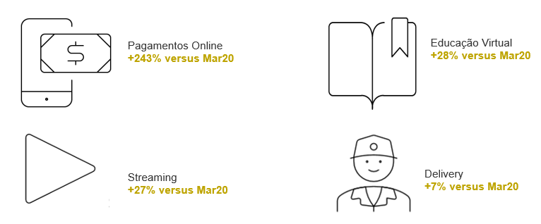 Ainda que a atividade publicitária tenha diminuído, surgiram novas oportunidades de direcionamento estratégico. Modelos de negócio que se beneficiam do isolamento apresentam crescimento de até 3 dígitos no número de inserções: