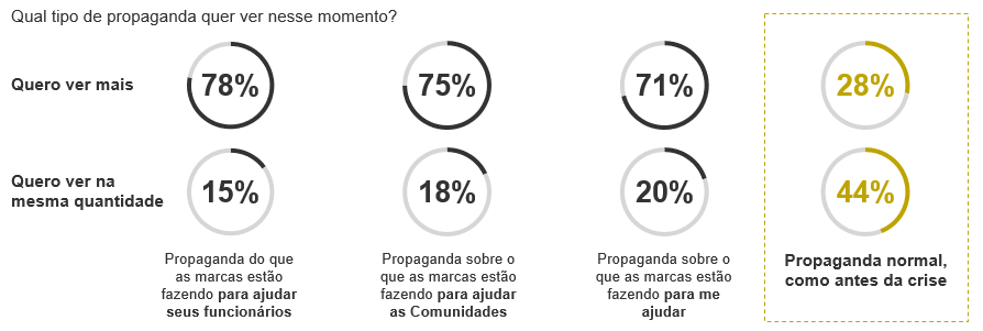 Consumidores acham que a vida e a economia precisam continuar. Alguns veem a propaganda como uma distração bem-vinda ou um lembrete agradável de tempos mais normais. Por isso, mesmo nesse momento tão delicado, o consumidor brasileiro diz querer ouvir o que as marcas estão fazendo e como podem contribuir para melhorar essa situação