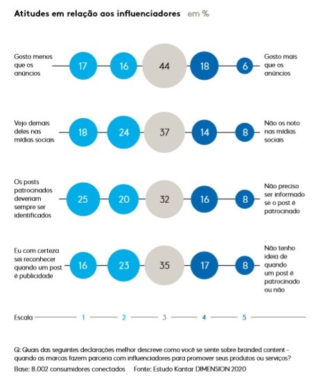 Os consumidores gostam de influenciadores? 42% dos consumidores concordam que vêm hoje muito conteúdo patrocinado nas mídias sociais. 25% acreditam que é altamente recomendável que essas postagens sejam identificadas de alguma forma. Isso cai para 11% na China, um dos principais mercados do setor.