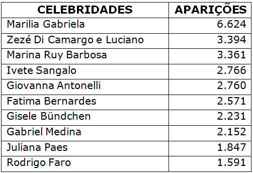 A jornalista e apresentadora Marília Gabriela foi a celebridade com o maior número de aparições em publicidade na TV aberta da cidade de São Paulo (SP) em 2015. De acordo dados do EasyCelebridades, da Kantar IBOPE Media, Marília Gabriela somou mais de 6 mil aparições no período. A dupla Zezé Di Camargo e Luciano e a atriz Marina Ruy Barbosa aparecem na sequência, com mais de 3 mil aparições cada. Confira abaixo o ranking com os dez destaques em aparições de publicidade na televisão aberta paulistana.