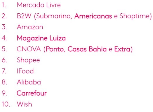 A Kantar IBOPE Media analisou o comportamento dos consumidores dos 10 principais players de varejo online no Brasil – todos possuem atualmente algum tipo de marketplace. Segundo os dados, cerca de 52% das pessoas acessaram pelo menos um desses sites no último mês. Essas plataformas estão conquistando mercado ao abrir espaço para que pequenas e médias empresas vendam seus produtos por meio delas. Entre eles, 4 têm suas marcas em lojas físicas, e os outros 6 são completamente digitais.