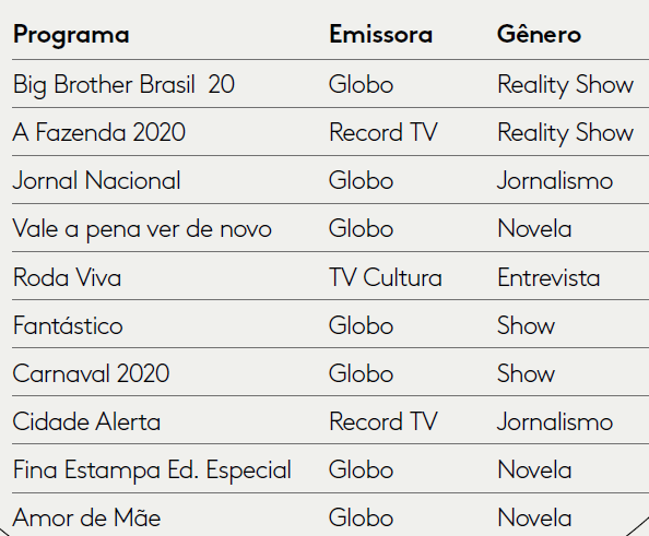 Os programas jornalísticos foram outro destaque. O gênero cresceu 119% no acumulado do ano e chegou a ser o mais comentado durante algumas semanas do primeiro trimestre, passando da 9ª colocação em 2019 para a 4ª em 2020. Cidade Alerta, Jornal Nacional e Roda Viva ficaram entre os programas mais comentados da TV aberta em 2020: