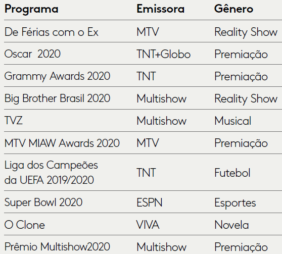 Os realities também tiveram ótimos resultados no segmento de TV paga. Mas enquanto o Big Brother Brasil foi o campeão na TV aberta, aqui ficou com a 4ª colocação, atrás de De Férias com o Ex, da MTV, e das premiações Oscar (TNT e Globo) e Grammy Awards (TNT).