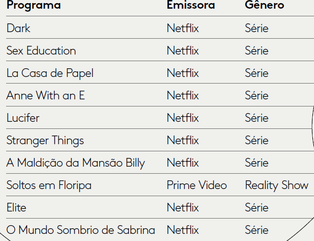 Os demais 9 colocados foram séries do Netflix: Dark, na primeira posição, seguida por Sex Education e La Casa de Papel. Continuidades aguardadas pelos fãs renderam mais buzz do que conteúdos estreantes.