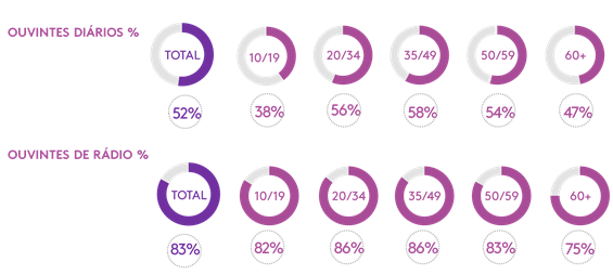 Enquanto 83% das pessoas escutam o meio, a média entre os mais jovens é maior do que entre os mais velhos. O destaque está entre aqueles que têm entre 20 e 49 anos, faixa etária que corresponde a 86% entre os que declararam escutar rádio nos últimos 30 dias.