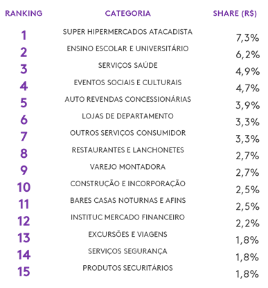 Já entre as categorias anunciantes nas praças monitoradas, destacam-se Super Hipermercados Atacadistas, Ensino Escolar Universitário e Serviços de Saúde.
