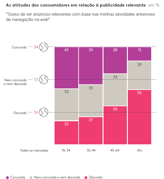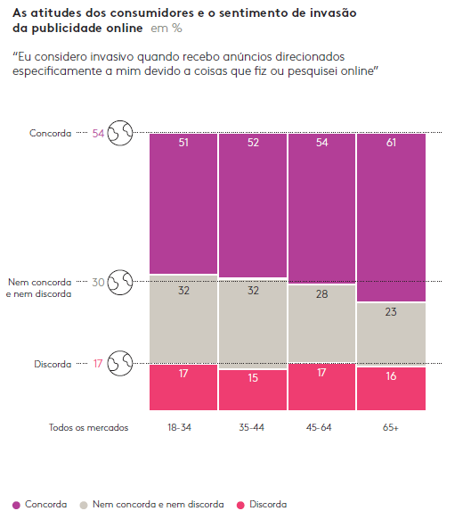 Além disso, às vezes, essa “experiência irritante” se manifesta como um mau uso de redirecionamento, como enviar mensagens a pessoas que já compraram o produto (algo que 56% dos consumidores conectados afirmam já ter acontecido). Os dados podem, e devem, ser aliados de uma ótima publicidade, mas eles devem ser coletados e usados com responsabilidade. Ignorar as preocupações e a recusa do consumidor pode ter repercussões muito negativas