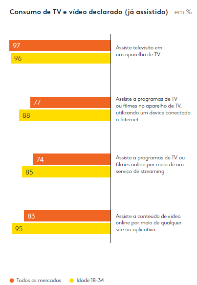E esta não é uma atividade ocasional. Nos oito países pesquisados, 77% dizem assistir TV em um aparelho de TV pelo menos uma vez por dia. Embora esse número diminua na faixa etária de 18 a 34 anos, ele ainda é alto, com 66%. Enquanto isso, 77% consomem conteúdo por meio de device conectado à TV, e 83% (chegando a 95% na faixa de 18 a 34 anos) fazem isso por meio de um site ou aplicativo.