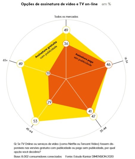 O Dimension revela que, ao contrário do consumo de serviços por assinatura, a inclinação do consumidor para modelos financiados por anúncios varia muito por idade. O grupo de pessoas mais jovens é dividido igualmente entre as duas opções, enquanto pessoas mais velhas preferem um serviço financiado por anúncio, o que talvez reflita o modelo com o qual cresceram.