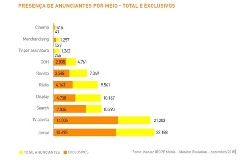Os anunciantes, protagonistas do mercado de publicidade, mostraram-se leais aos meios com os quais possuem afinidade no decorrer do ano passado. Segundo o estudo Retrospectiva & Perspectivas, da Kantar IBOPE Media, 46.730 marcas e empresas compraram espaço publicitário nos meios e veículos monitorados pela empresa em 2015. Em Search, do total de 10.390 anunciantes, 68% usaram somente esta mídia em sua estratégia de publicidade. Na TV aberta, 66% de 21.203 marcas compraram espaço publicitário exclusividade nesta mídia. No caso do jornal, o patamar de anunciantes exclusivos também foi expressivo: 62% de 22.188.