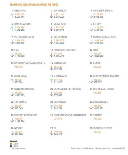 Os 30 maiores anunciantes do Brasil são responsáveis por 30% do volume de compra de espaço publicitário do país. A Genomma, que passou da terceira para a primeira posição no ranking em 2015, registrou crescimento de 15% na comparação com o ano anterior, somando o equivalente a R$ 3,9 bilhões. A Via Varejo vem em segundo lugar, com aquisições na ordem de R$ 3,8 bilhões e queda de 10% em relação a 2014. A empresa inverteu de posição no ranking com a Unilever Brasil, que passou a ocupar a terceira posição em 2015, com R$ 3,1 bilhões em volume de compra de espaço publicitário – uma retração de 18% em comparação ao ano anterior.