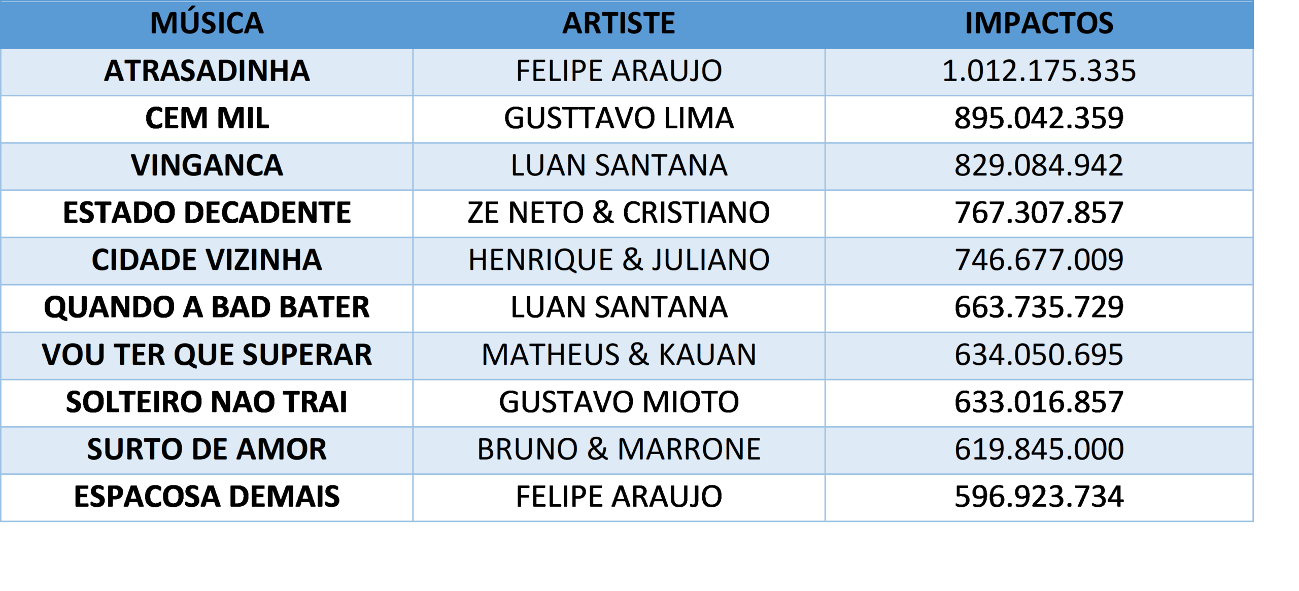 A música mais ouvida no ano nas rádios foi Atrasadinha, de Felipe Araújo, também do gênero Sertanejo, e foi a única a registrar mais de um bilhão de impactos no ano.