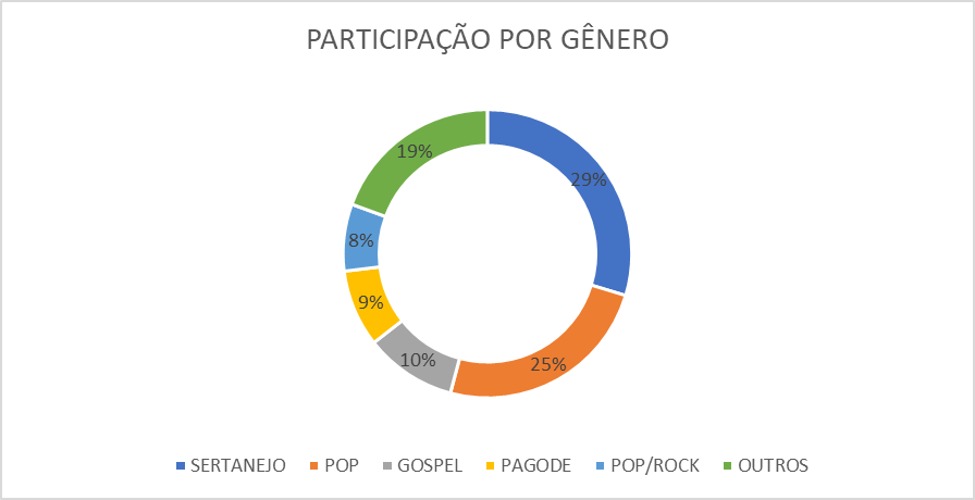 O Music Heat indica que as músicas no rádio foram ouvidas mais de 175 bilhões de vezes no Brasil em 2019. Os cinco gêneros mais ouvidos correspondem a mais de 80% de todo o consumo de músicas no meio: