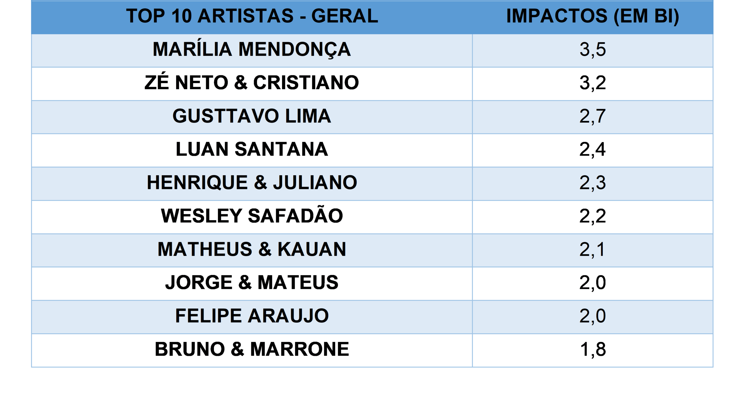 Entre os artistas mais ouvidos nas rádios, o Sertanejo também domina o ranking, liderado pela cantora Marília Mendonça.