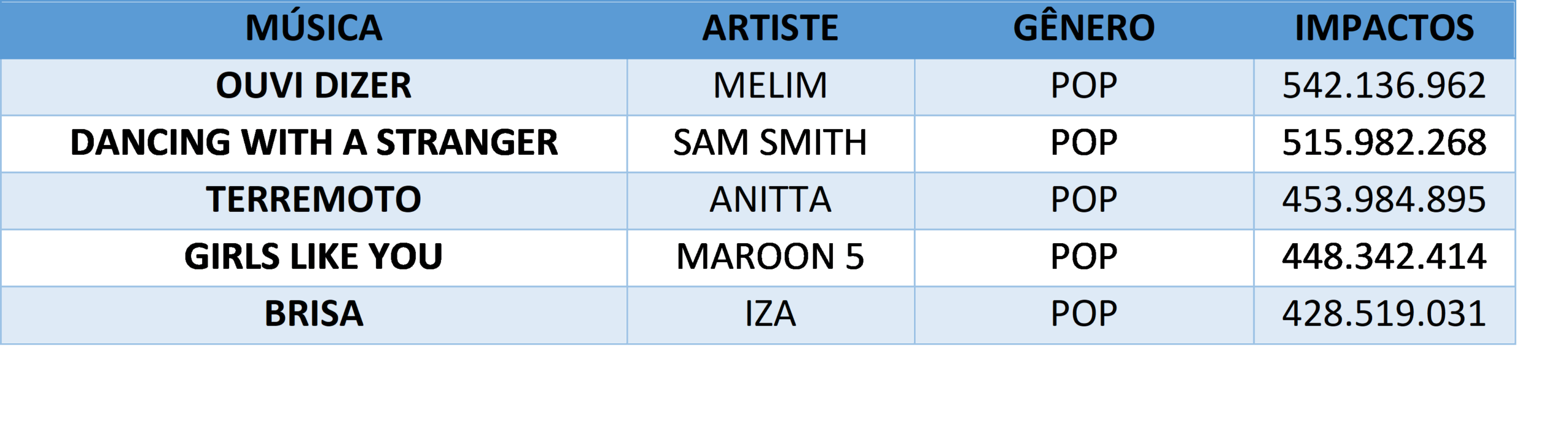 Já entre as músicas mais ouvidas do gênero Pop, o segundo mais consumido, a primeira música é “Ouvi Dizer”, de Melim, que alcançou a 18ª posição no ranking geral.