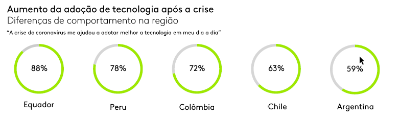 A adoção de novas tecnologias, em geral, é uma resposta a um desafio ou necessidade. Em um cenário em contaste transformação e com grandes rupturas, o futuro chega mais rápido. A atual crise provocada pela pandemia de Covid-19 impactou o nosso cotidiano e mudou hábitos e comportamentos da população, acelerando uma mudança que já estava em curso. De acordo com dados do Target Group Index Flash Pandemic, 56% dos brasileiros concordam que a crise do coronavírus serviu como estímulo para que as pessoas passassem a adotar melhor a tecnologia no dia-a-dia – um fenômeno que se repete em outros países da América Latina.