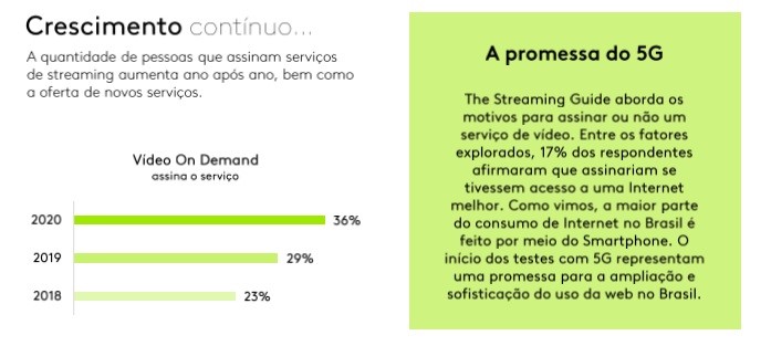 Outra característica desse momento é a experimentação: passando cada vez mais tempo em casa, os brasileiros se permitiram testar novas formas de acessar conteúdo. O Data Stories apresenta alguns insights do The Streaming Guide, estudo inédito da Kantar IBOPE Media, que mostram a força que o streaming vem conquistando no país. De acordo com o estudo, 98% dos usuários de internet consumem algum tipo de conteúdo via streaming de áudio ou vídeo, e 73% afirmam que o consumo de streaming de vídeo (pago ou gratuito) aumentou após o início da atual crise. Em 2020, o número de assinantes de serviços de streaming atingiu 36%, contra 29% no ano anterior.