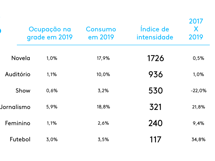 O estudo também mostra um índice que mede a relação entre o tempo de exibição e o tempo consumido de uma programação. Números acima de 100 significam uma alta intensidade de consumo. O ranking de intensidade é maior no gênero novela, mas gêneros ao vivo – chamados de TV FOMO (Fear Of Missing Out) ganharam muita relevância entre os consumidores.
