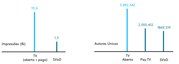Esse número também se reflete nas redes sociais. Os gêneros mais comentados foram reality shows, séries, novelas, premiações e esportes. Já as conversas sobre conteúdo em vídeo atingiram 21 bilhões de impressões no Twitter em 2019. A TV segue dominando a rede, com 15 vezes mais impactos do que com vídeos on demand.