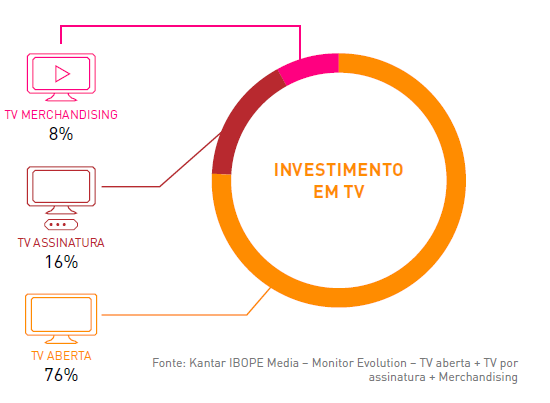 A televisão, sendo TV aberta, paga e merchandising, foi o principal destino de publicidade no último ano. O meio atraiu mais de dois terços do equivalente à compra de espaços publicitários no Brasil, com participação de 70% no volume total.