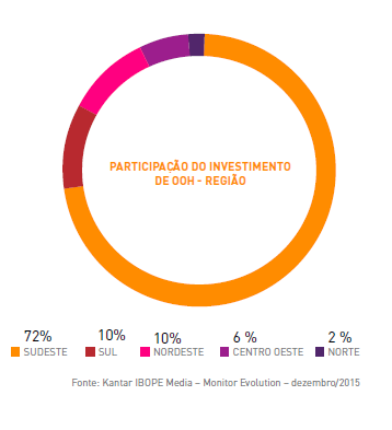 Outra novidade da Kantar IBOPE Media presente no estudo Retrospectiva & Perspectivas 2015 é a reestruturação das informações na base de compra de espaços publicitários dedicados a mídia exterior, realizada com apoio da Associação Brasileira de Mídia Out of Home (ABMOOH), do Grupo de Mídia e das exibidoras. No último ano, a compra de espaço publicitário em Out Of Home (OOH) representou o equivalente a R$ 1,5 bilhão, divididos entre mobiliário urbano (91%) e outdoor (9%). Do total, 72% está concentrado em mercados da região sudeste, seguidos pelas regiões sul (10%), nordeste (10%), centro-oeste (6%) e norte (2%).
