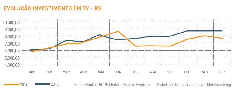 Ao contrário de 2014, quando o comportamento do mercado publicitário apresentou oscilações ocasionadas pelo Mundial de Futebol e pelas eleições, no ano passado foi possível observar estabilidade e uma curva ascendente no segundo semestre. Esse movimento é perceptível também no volume de inserções, que chegou a 21,8 milhões de veiculações em 2015, mesmo patamar do ano anterior. Considerando todo o volume publicitário em televisão, a compra de espaço na TV aberta atraiu 76% do total. A TV paga absorveu 16% e os formatos exibidos dentro dos programas (merchandising), 8%.