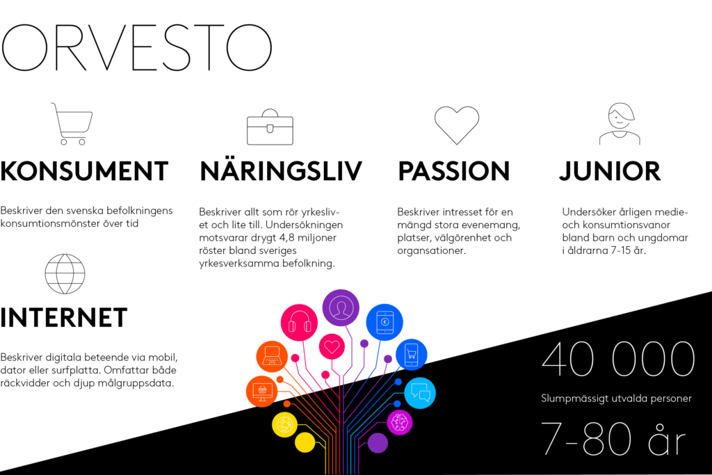 I Sveriges största medie- och målgruppsundersökning, ORVESTO® Konsument, med svar från cirka 40 000 slumpmässigt utvalda personer i åldern 16-80 år, beskrivs den svenska befolkningens konsumtionsmönster, livsstil och mediekonsumtion.